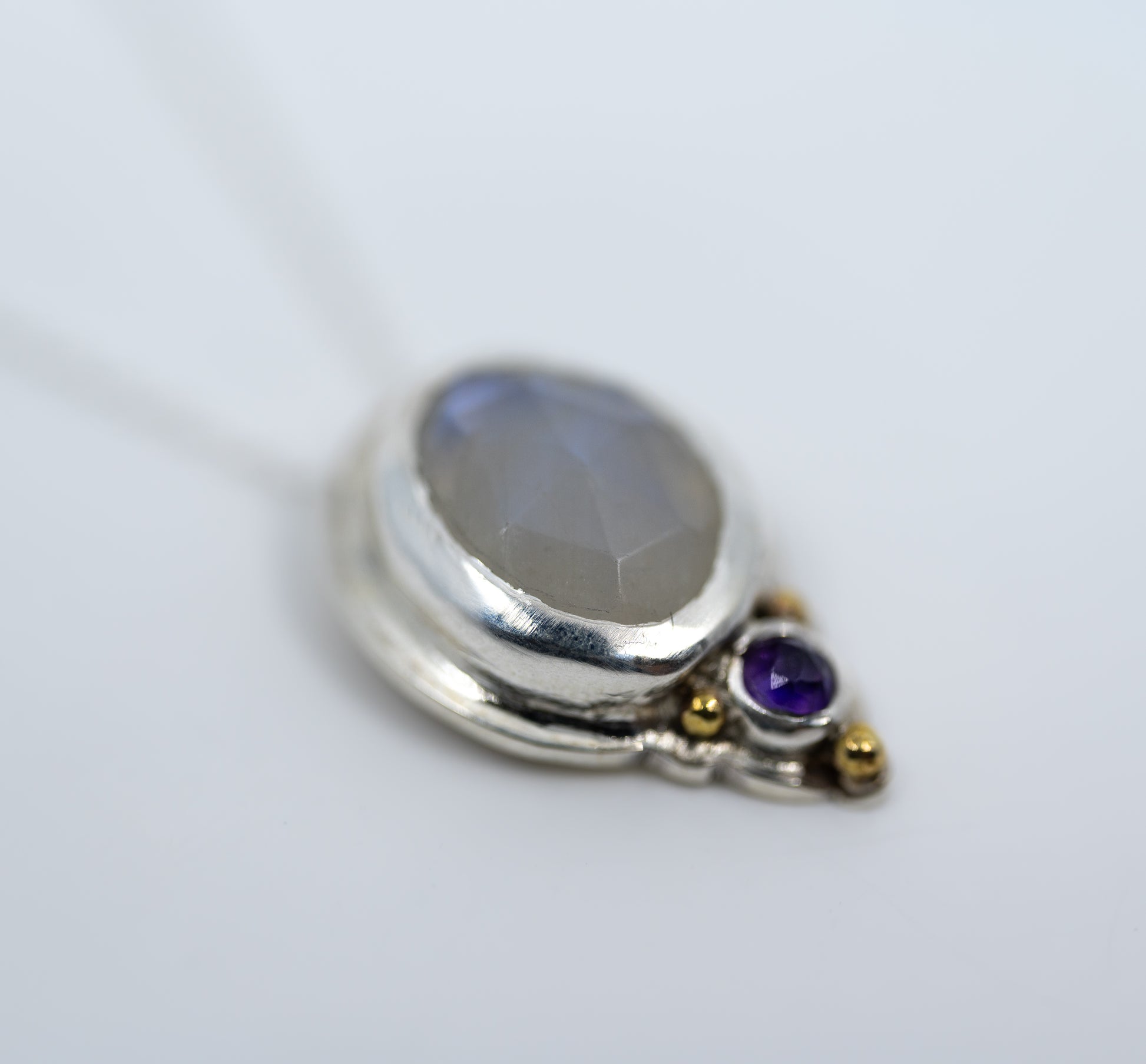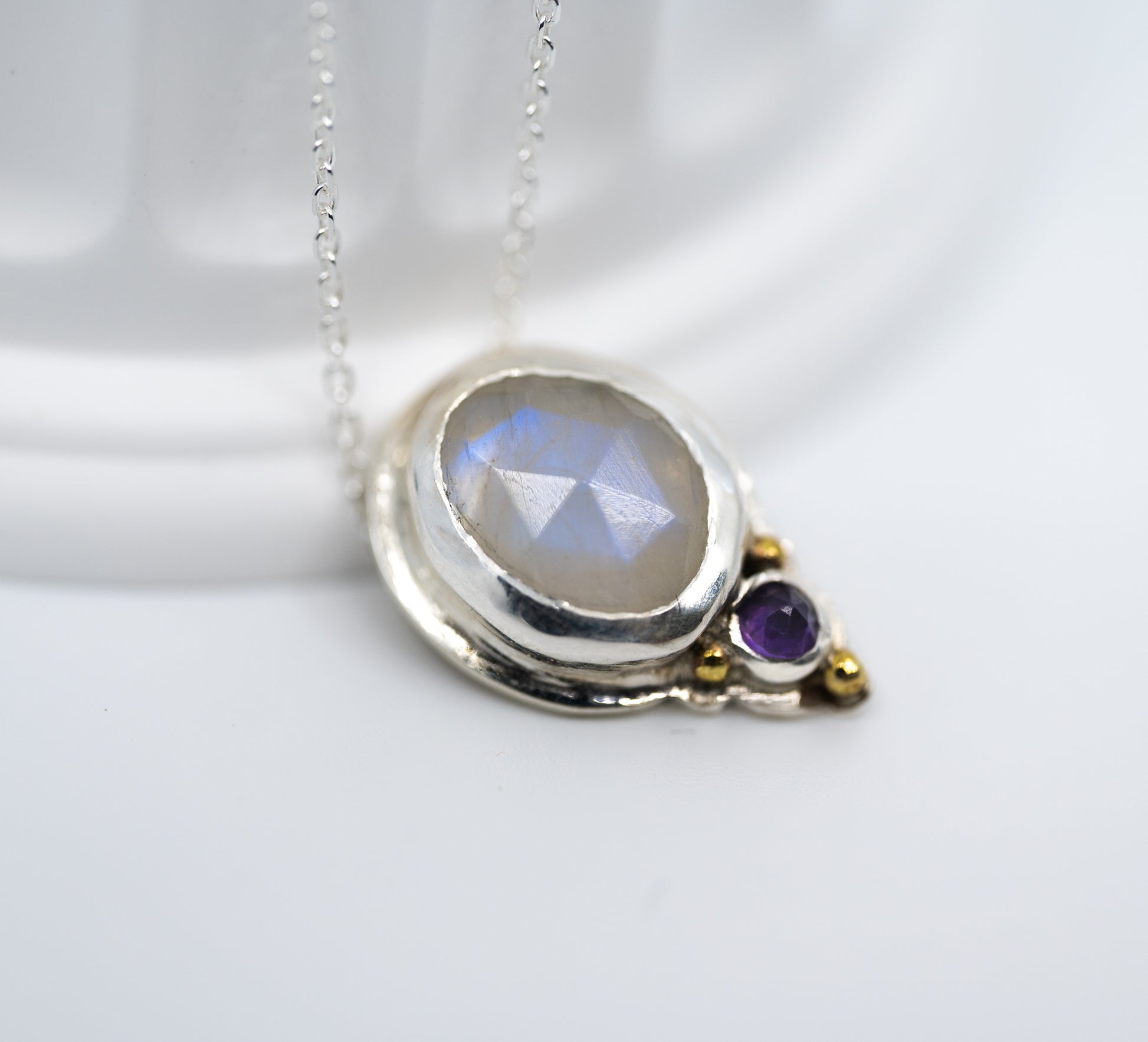 Intuition Pendant This refined pendant draws inspiration from inner knowing, uniting moonstone's luminous clarity with amethyst's meditative energy. Anchored in sterling silver and warm brass, the design celebrates the quiet wisdom we carry within. Each stone is thoughtfully positioned to create visual balance—a wearable reminder to trust your instincts and embrace your intuitive voice.